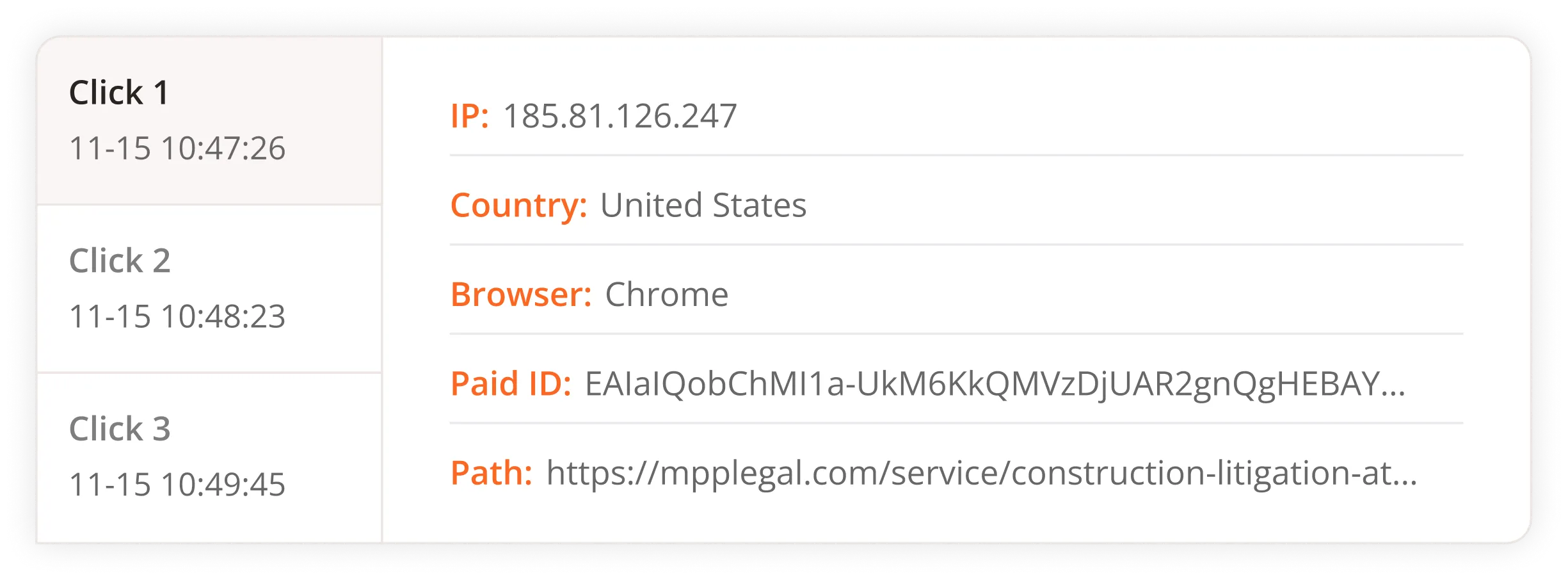 Get a 30+ data point breakdown of each click, that is unattainable on Google Ads and Facebook Ads analytic platforms.